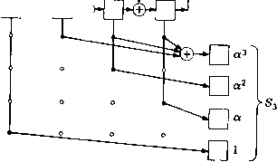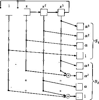 (5.21) Например, если /г = 15 и а -корень многочлена ж* + а;--1, т© "О О 0-1 О О 1 1 О 1 О 1 1 1 1] 0010011010111 О 010011010111100 100010011010111 011110111101111 001010010100101 000110001100011 100011000110001 Синдром S = JR содержит 2т координат. Первые т координат дают Si, сумму локаторов ошибочных позиций; вторые т координат синдрома дают S, сумму кубов локаторов искаженных позиций. Если принятый вектор представить многочленом R (х) = 2 i*, К) = л (а) и 3 = Д (а*). Принятый вектор позволяет вычислить каждую из этих сумм в отдельности. Для вычисления S- надо разделить R (х) на минимальный многочлен Tlf) (х) элемента а п найти остаток от деления г*) (х). Тогда имеет место равенство Sx = /-(i) (а). Для вычисления S надо разделить R (х) на минимальный многочлен 7lf(*) (х) элемента а, найти остаток от деления г() (х) и вычислить затем = г*) (а). В общем случае вычисление 5з по г() может потребовать просчета не более чем т проверочных соотношений с не более чем т входами i). В рассматриваемом примере минимальным многочленом для а* является ж* Н- ж* -Ь х а; -Ь 1. Многочлены т-) (х) и г(*> (х) могут быть получены с помощью схемы, изображенной на рис. 5.6. Получаемые декодером из канала связи позиции подаются в 15-позицион-ный буферный регистр, изображенный нарис. 5.6 горизонтально вверху. После приема всех 15 позиций блока в буфере оказывается записанным многочлен R (х), представляющий принятое слово. Одновременно с буферным регистром принятое слово поступает еще в два регистра, обратные связи которых подобраны в соответствии с минимальными многочленами для а и а*. Начальное состояние обоих регистров является нулевым. При вводе позиций из канала эти регистры осуществляют деление соответственно на минимальный многочлен Л/1) (х) элемента а и минимальный многочлен ilf (х) элемента а*. При окончании приема входного блока из 15 позиций в регистрах содержатся соответственно остатки г) (х) д г) (х). Степенные суммы S-, S и S вычисляются по остаткам r(i) (х) и г*) (х) путем «матричного» умножения, изображенного на рисунке с помощью вертикальных регистров и вентильных схем. Матрица, используемая для получения S- по г) (х), оказывается единичной; поэтому S-i просто совпадает с г) (а). Однако вычисление 8,= = г) (а) и Ss = г(*) (а*) требует более сложной схемы. Связи для этих матриц умножения легко могут быть получены из первых т столбцов расширенной матрицы SB, которые для рассматриваемого примера имеют вид 0 0 0 1 laaa < q 1 О О 10 0 0 ) можно получить акже путем деления R(x) на il/<i)(x). Этот способ позволяет обойтись без специального регистра, выполняющего деление на (), но требует намного большего числа сдвигов. а:13 Д.14 ![]() ![]() 1 а2 а* а" 1аЗа« а»- 0 0 0 1 0 10 1 0 0 10 10 10 0 111 0 0 10 0 0 0 1 10 0 0 Рис. 5.6. Первая часть декодера для БЧХ-кода, исправляющего две ошибки. Так как элемент сопряжен с а, то он имеет тот же минимальный многочлен и, следовательно, может быть вычислен по тому же остатку, что и S. Поэтому в общем случае можно не включать в проверочную матрицу, хотя это и не принесет вреда. Расширенная проверочная матрица (включающая в себя, помимо самих локаторов и их кубов, квадраты локаторов) имеет больше строк, чем обычная проверочная матрица. Однако дополнительные строки являются линейными комбинациями первых т строк, и ранг расширенной проверочной матрицы равен рангу обычной проверочной матрицы. Проверочная матрица может быть расширена еще больше, если добавить сопряженные с Зи Sg, т. е. Si,, Sg или Sg. Суммы SiVi Sg могут быть вычислены но остат