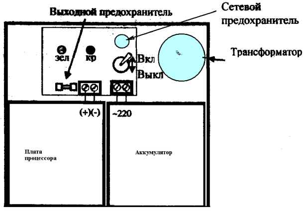 Примечание - Допускается замена на аналоги других производителей 1.4 Устройство и работа 1.4.1 Прибор выполнен в виде блока в металлическом корпусе, предназначенном для настенной установки (см. рис. 1.1). На боковой поверхности корпуса имеются вводы для подключения проводов электропитания, оповещателей, ИМК и ШС и установлена кнопка ЗВУК для отключения ОЗ. Блок имеет съемную пластмассовую крышку, закрепляемую двумя винтами. Внутри корпуса расположены: сетевой трансформатор, плата питания и плата процессора с радиоволновым датчиком. В нижней части корпуса предусмотрено место для установки АБ. 1.4.2 Плата питания обеспечивает формирование напряжения +12В при питании прибора от сети переменного тока или от АБ в отсутствие сетевого напряжения. Сетевое напряжение подается на клеммную колодку, установленную на плате под тумблером включения электропитания. Слева от колодки расположен предохранитель (5А) выходной цепи +12В, над тумблером - сетевой предохранитель (0,5А). Положение тумблера ВКЛ соответствует режиму РАБОТА. В положении ВЫКЛ напряжение +12В не формируется. Режимы работы платы питания отображают светодиодные индикаторы: «СЕТЬ» (зелёный) - наличие сетевого напряжения, «АБ» (красный) - наличие напряжения +12В. При питании прибора от сети светятся оба индикатора. При пропадании сетевого напряжения индикатор «СЕТЬ» гаснет, и прибор ![]() Рис. 1.1 1.4.3 На плате процессора (см. рис. 1.2) размещены: радиоволновый датчик, перемычки «1» - «5», светодиодные индикаторы и коммутационные колодки. Работа радиоволнового датчика основана на регистрации изменения частоты радиоволн, отраженных от движущегося объекта (эффект Доплера). Обработка сигналов радиоволнового датчика осуществляется процессором. Регулировка дальности действия производится перемычками. При поставке прибора установлена минимальная дальность (3±1 м). Режимы работы прибора отображают светодиодные индикаторы. Индикатор ТРЕВОГА сигнализирует о выдаче извещения о тревоге, индикатор ЗВУК - об отключении ОЗ. Индикатор ПОРОГ (зеленого цвета) используется для определения границ зоны обнаружения при настройке прибора. В дежурном режиме индикатор отключен. Для его включения необходимо соединить проволочной перемычкой контакты +12В и ДК на коммутационной колодке или непрерывно подавать сигнал ПРОВЕРКА. Индикатор загорается при превышении сигналом от радиоволнового датчика заданного с помощью перемычек порогового уровня. автоматически переходит на питание от АБ, что индицирует свечение индикатора «АБ». Переход в исходный режим при восстановлении сетевого напряжения также производится автоматически. При разряде АБ до напряжения (10-10,5) В происходит её отключение от нагрузки, индикатор «АБ» гаснет и на ПЦН непрерывно выдается тревожное извещение. [0] [ 1 ] [2] [3] [4] [5] 0.0124 |